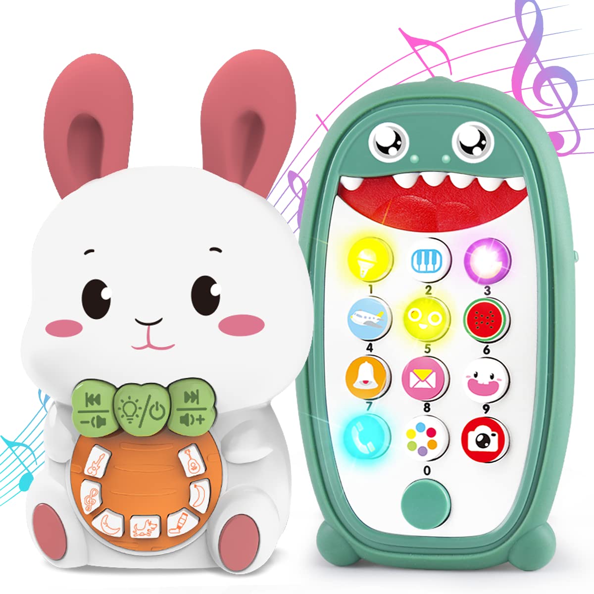 Amazon Com Fuzzy Pixie Baby Phone And Music Toy Bundle With Tetther Light And Adjustable Volume Educational Learning Birthday Gift For Baby Infant Kids Boys Or Girls 18 Months Rabbit And Dinosaur Green